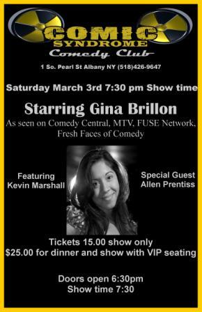 Show headlined by NYC standout Gina Brillon (featured on Comedy Central among others) and featuring Kevin Marshall.